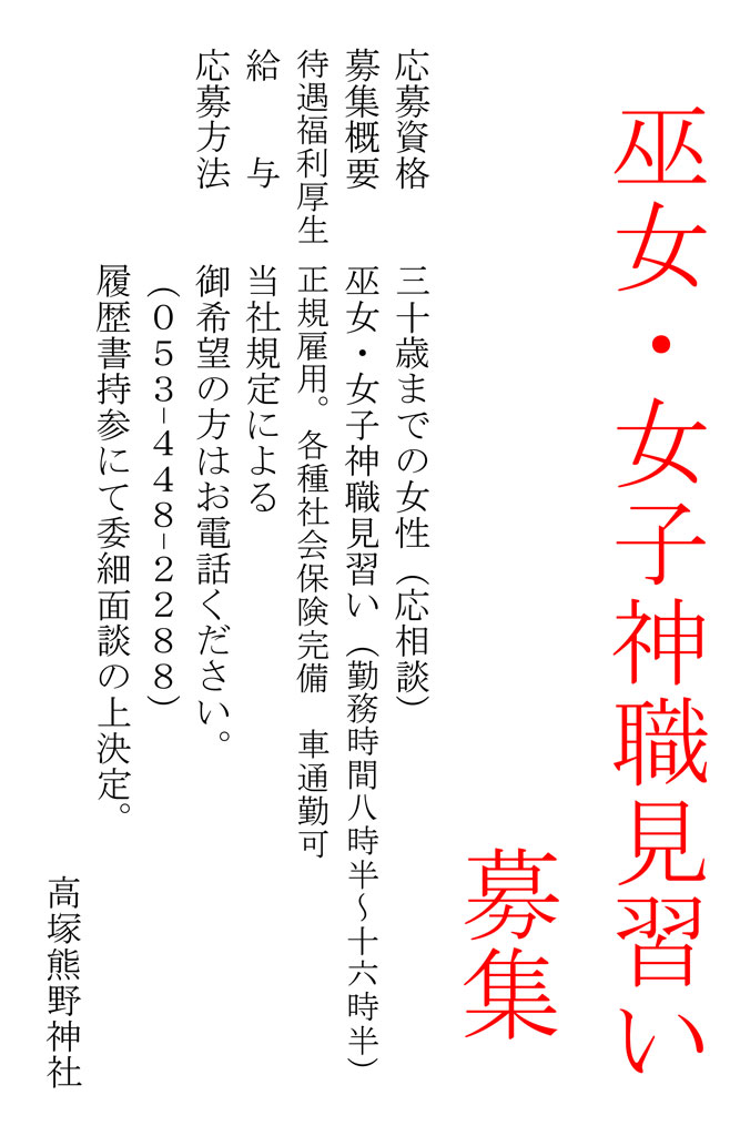 当神社にて「巫女・神職(女性)」を募集いたします! 応募資格や、募集概要につきましては以下のとおりになります。 気になる方や神職に興味があってなってみたいという方がいらっしゃいましたら 是非ご応募をお待ちしております。 また、不明な点がございましたら、お気軽にお問い合わせください。